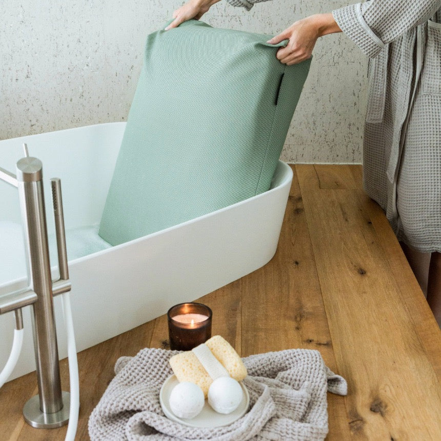 Magic Dry Functie – Het BADESOFA badkussen kan na het baden gewoon in de badkuip blijven liggen. Dankzij het binnenkussen van 3D-mesh loopt het water vrij en vanzelf uit het kussen, terwijl de lucht binnenin kan circuleren. Hierdoor droogt het BADESOFA snel.