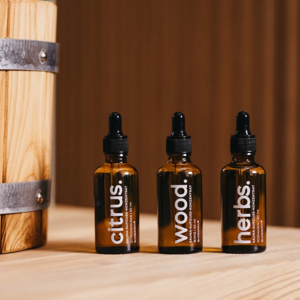 Dompel jezelf onder in de wereld van ontspanning met onze saunaopgiet-concentraten. Ervaar drie verschillende geuren – Herbs, Citrus, Wood – voor een onvergetelijke sauna-ervaring.