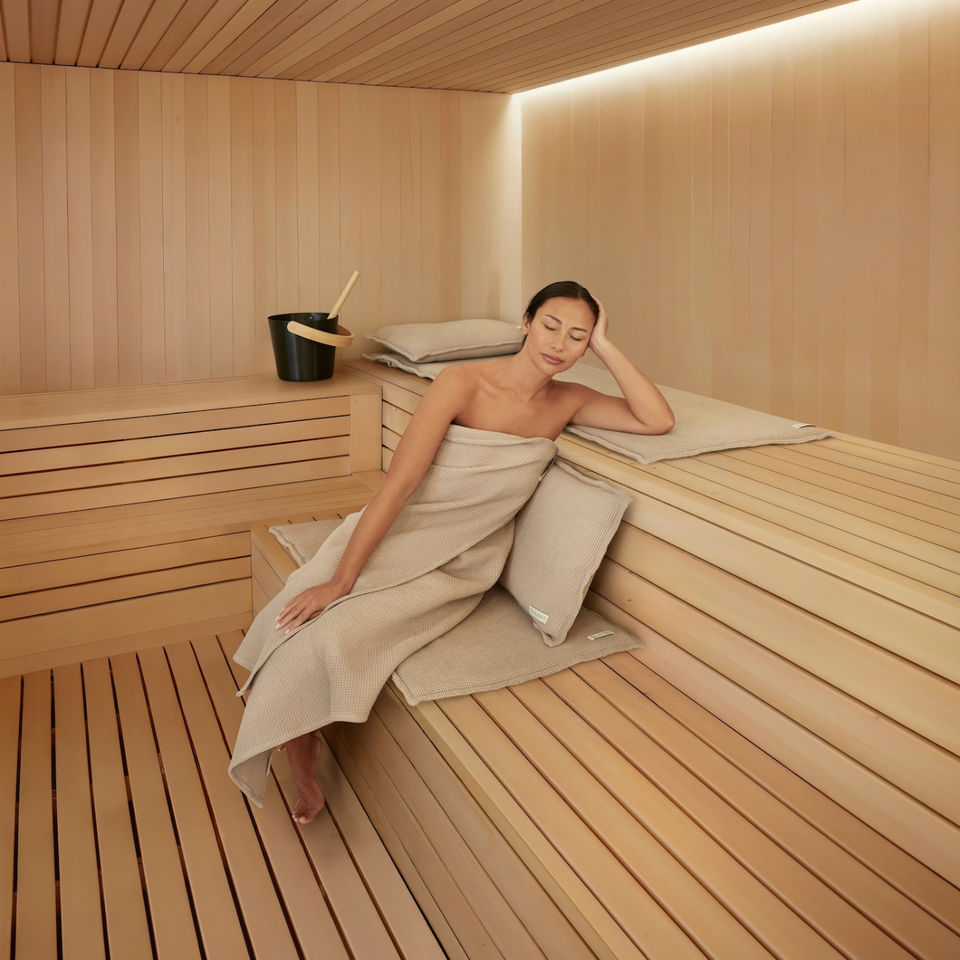 Dankzij onze gepolsterde sauna-onderlagen en bijpassende accessoires voel je je in de sauna alsof je op wolken ligt. Nog nooit heb je zo comfortabel in de sauna gelegen.