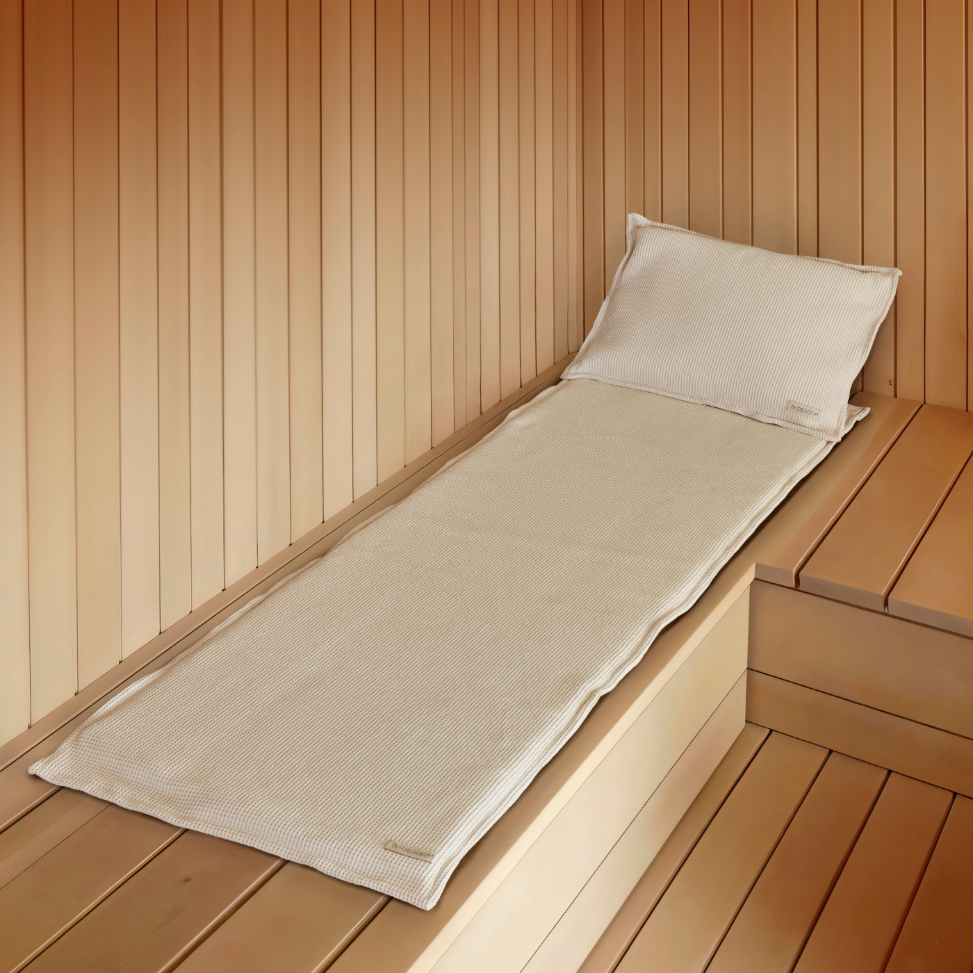 Het SAUNASOFA bestaat uit een gewatteerde saunamat en een hoofdkussen. Het is gemaakt van biologisch katoen en gerecycled polyester en is ontworpen om de hitte van de sauna te weerstaan zonder schadelijke stoffen af te geven.