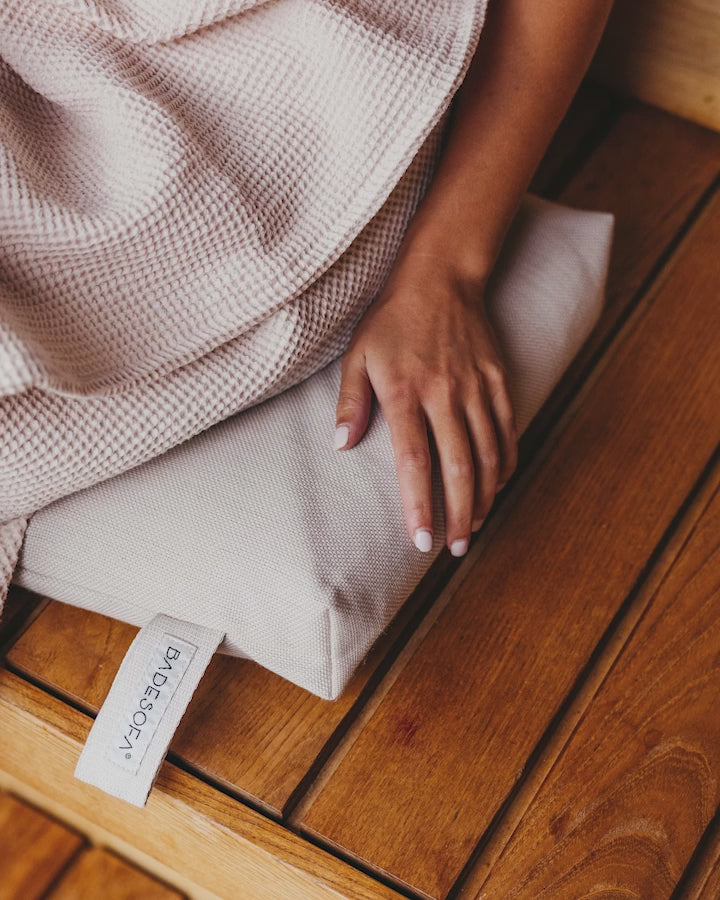 Het stoomsauna-set, bestaande uit een saunahanddoek en het BADESOFA zitkussen, laat je comfortabel zitten of leunen in de stoomsauna. Maximaliseer zo je ontspanning.